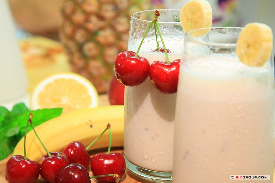Bananen mit Milch, Zucker und Kirschen im Mixer pürieren.
