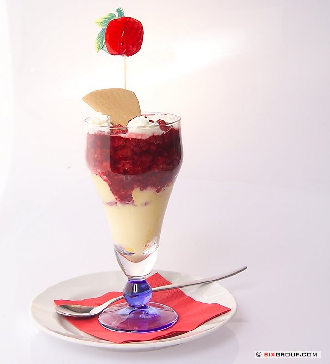 Himbeeren mit Zitronensaft und Zucker erwärmen. Die Himbeeren in ein schönes Glas oder einen tiefen Teller geben, das Vanilleeis darauf geben und mit geschlagener Sahne garnieren.