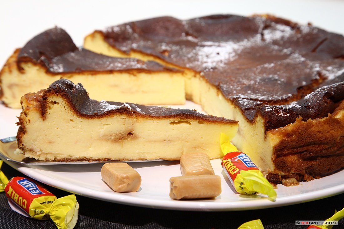 Eine Springform (28cm) mit Backpapier auslegen. Die Eier in Eigelbe und Eiweiße trennen. Die Butter mit Zucker schaumig rühren. Die Eigelbe nach und nach hinzufügen. Magerquark, Mascarpone und Puddingpulver unterrühren. Eiweiße zu steifem Schnee schlagen und mit der Speisestärke unter die Quarkmasse ziehen. Zum Schluß die weichen Karamellbonbons (Caramel mou) unterheben.