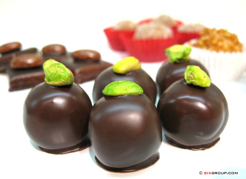 Kuvertüre hacken, im warmen Wasserbad schmelzen. Kugeln damit überziehen, mit je 1 Pistazie verzieren. Trocknen lassen.