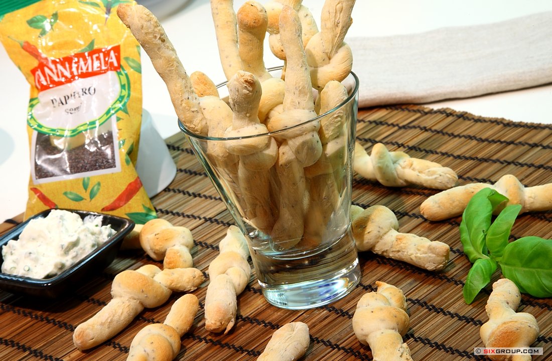 Den Teig in ca. 30 Portionen teilen, diese in nicht zu dünne Stangen rollen und einen Knoten hineinknoten. Auf ein mit Backpapier belegtes Backblech legen und im Backofen ca. 5-8Min. backen. Die Grissini sollten nicht zu dunkel werden.