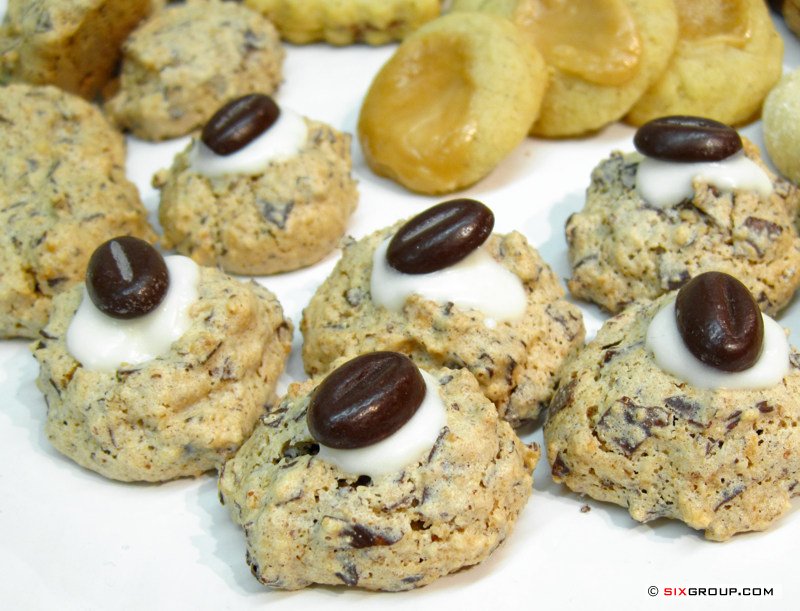 Die weiße Kuvertüre im Wasserbad schmelzen und die ausgekühlten Makronen damit verzieren, je eine Mokkabohne auf die Kuvertüre setzen und trocknen lassen.
