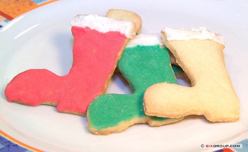 Teig dünn ausrollen, verschieden große Stiefel ausstechen und auf mit Backpapier belegte Backbleche legen. Im Backofen ca. 10-12 Min. backen.