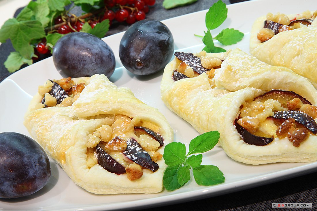 Blätterteig in 10x10cm große Quadrate schneiden. Je 2-3EL Puddingcreme auf jedes Teigquadrat verteilen, mit den Pflaumenspalten belegen und mit den Marzipanwürfeln bestreuen.