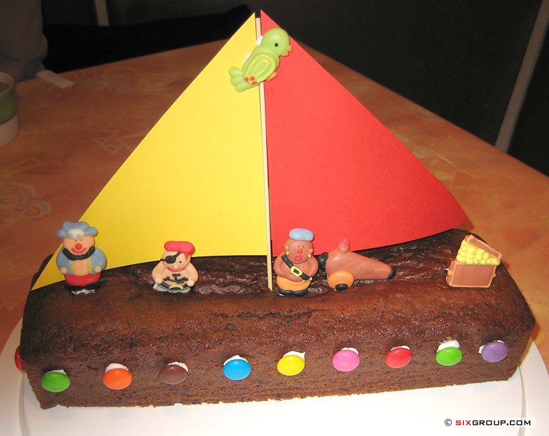 Eiweiß mit Puderzucker zu einem dickflüssigen Guß verrühren. An die Längsseiten des Schiffes mit Zuckerguß die Bullaugen aus Schokolinsen kleben. Aus Papier ein Segel basteln, das auf einen Schaschlikspieß geklebt wird. Der Spieß muß unten etwas überstehen, damit man ihn in den Kuchen stecken kann. Piraten aus Zucker oder Gummibärchen als Besatzung auf das Schiff kleben.