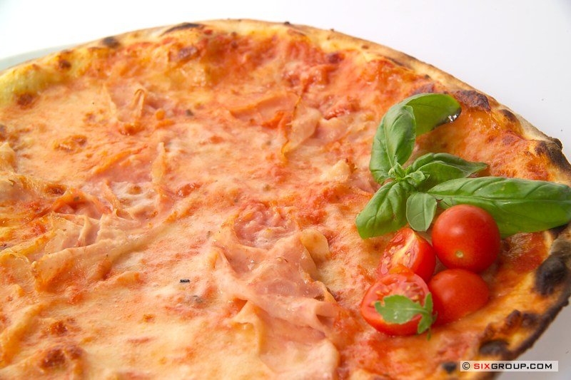 Auf dem Pizzateig verstreichen. Mozzarella in dünne Scheiben oder Würfel schneiden und darauf verteilen. Dann mit Schinken belegen.