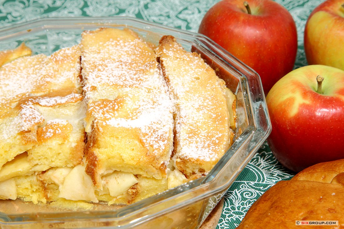 Nun eine Auflaufform fetten und mit Zucker ausstreuen. Die Hälfte der Zopfmasse einfüllen, die Apfelfüllung darauf verteilen und die restliche Masse darauf geben.